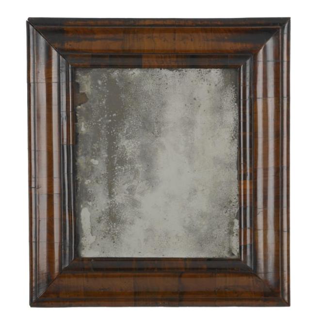 In the years 1675 to 1725 mirrors listed in probate inventories of the middle classes increased from 22 to 40%.[2] The example pictured above is typical of the sort of glass you may have found in such a home by this time. The frame is humble in design, with olive-wood veneer making up its moulded cushion-shape and the only possible embellishment hinted at by two holes at the top, showing a potential for a cresting similar to that shown below. English-made, modest-sized and with a humble wooden-frame, it would have made a firm statement of ‘politeness and gentility’ of which visitors to the home would have approved.